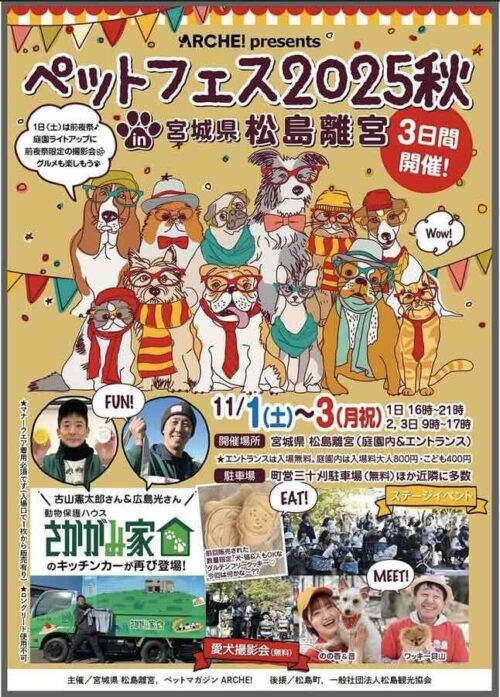 2025年11月1日(土)、2日(日)、3日(月・祝)宮城県宮城郡にある宮城県松島離宮にて『ARCHE! presents ペットフェス2025秋 in 宮城県松島離宮』開催されます。 ARCHE...