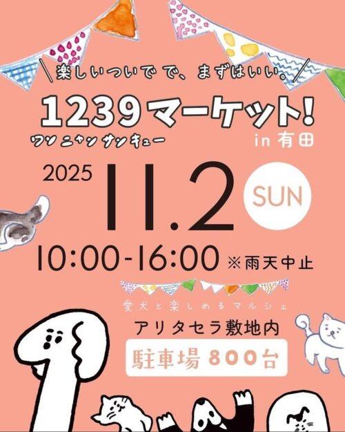 2025年11月2日(日)佐賀県西松浦郡にあるアリタセラにて『1239マーケット!(ワンニャンサンキュー)』が開催されます。 \1239マーケット!開催決定のお知らせ/ みな...