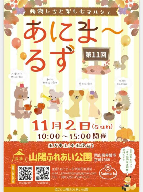 2025年11月2日(日)岡山県赤磐市にある山陽ふれあい公園にて『第11回あにま~るず』が開催されます。 第11回目 あにま~るず 11月2日(日) 雨天中止(小雨決行) 10時...