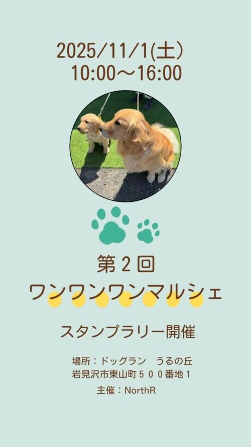 2025年11月1日(土)北海道岩見沢市にあるドッグラン うるの丘にて『第2回 ワンワンワンマルシェ』が開催されます。 🐾🐶第二回 ワンワンワンマルシェ...