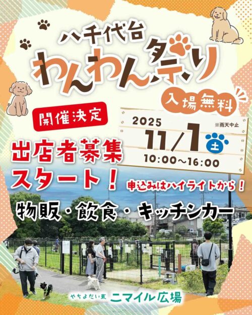 2025年11月1日(土)千葉県八千代市にあるやちよだい東ニマイル広場にて『八千代台わんわん祭り』が開催されます。 様々なワンコ関連アイテムやグッズ、サービスのお店...