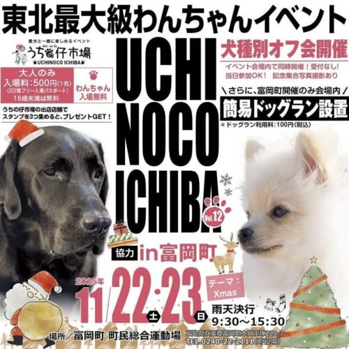 2025年11月22日(土)、23日(日)福島県双葉郡にある富岡町 町民総合運動場にて東北最大のわんちゃんイベント『うちの仔市場 in 富岡』が開催されます。 愛犬と楽しむ2...