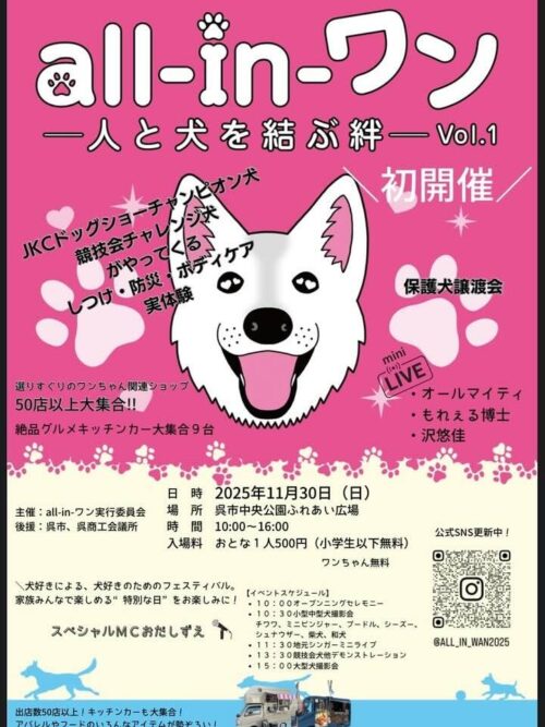2025年11月30日(日)広島県呉市にある呉中央公園 ふれあい広場 特設会場にて『all-in-ワン2025 -犬と結ぶ絆- Vol.1』が開催されます。 all-in-ワン2025 出店者様の御紹...