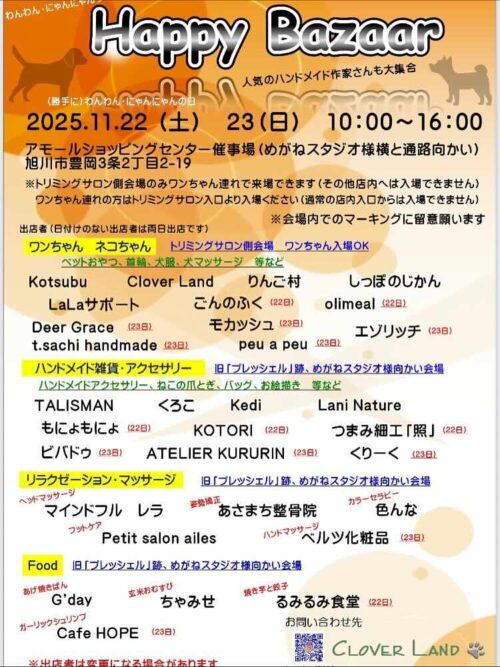 2025年11月22日(土)、23日(日)北海道旭川市にあるアモールショッピングセンターにて『HAPPY BAZAAR ~ハッピーバザール-inアモール』が開催されます。 Happy Bazaar ...