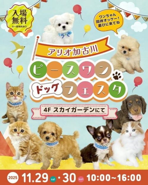 2025年11月29日(土)、30日(日)兵庫県加古川市にあるアリオ加古川4F スカイガーデンにて『ピースワンドッグフェスタ』が開催されます。 【アリオ加古川】ピースワン...