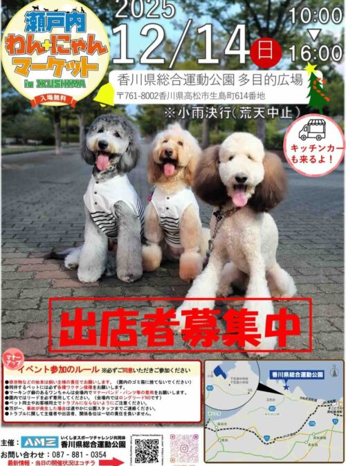 2025年12月14日(日)香川県高松市にある香川県総合運動公園 多目的広場にて『瀬戸内わん+にゃんマーケットin IKUSHIMA』が開催されます。 様々なワンコ関連アイテムや...