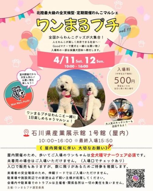 2026年4月11日(土)、12日(日)石川県金沢市にある産業展示館1号館にて北陸最大級の全天候型・定期開催わんこマルシェェ『ワンまるプチ vol.11』が開催されます。 ...