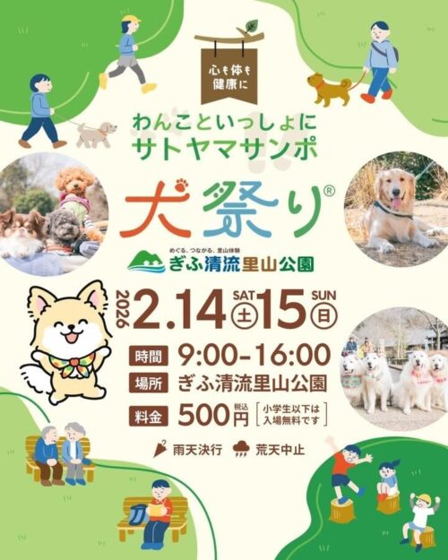 2026年2月14日(土)、15日(日)岐阜県美濃加茂市にあるぎふ清流里山公園にて心も体も健康に!わんこと一緒にサトヤマサンポ『犬祭り@ぎふ清流里山公園』が 開催されま...