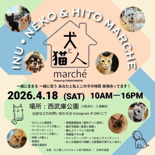 2026年4月18日(土)兵庫県尼崎市にある西武庫公園にて『犬と猫と人のマルシェ』が開催されます。 2026.01.12🐶🐱🧒🏻 犬と猫と人のマルシ...