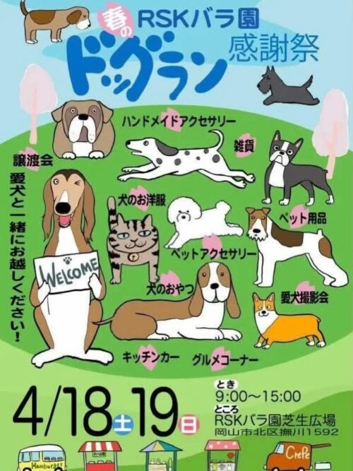 2026年4月18日(土)、19日(日)岡山県岡山市にあるRSKバラ園 芝生広場にて『RSKバラ園 春のドッグラン感謝祭』が開催されます。 [2026年RSKバラ園春のドッグラン感謝...