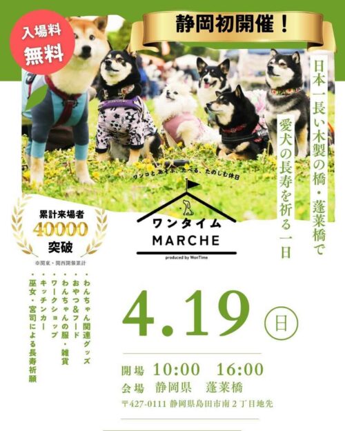 2026年4月19日(土)静岡県島田市にある蓬莱橋にてわんことあそぶ、食べる、たのしむ休日イベント『ワンタイムマルシェ in 静岡県島田市蓬莱橋』が開催されます。 ...