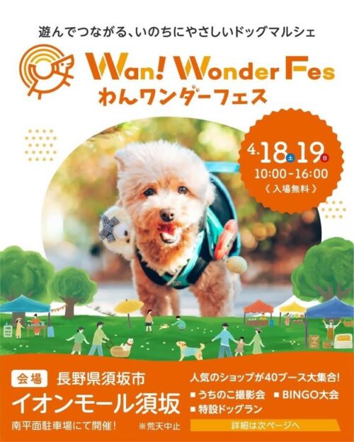 2026年4月18日(土)、19日(日)長野県須坂市にあるイオンモール須坂にて『わんワンダーフェス』が開催されます。 【わんワンダーフェス@イオンモール須坂】 2026年4月...